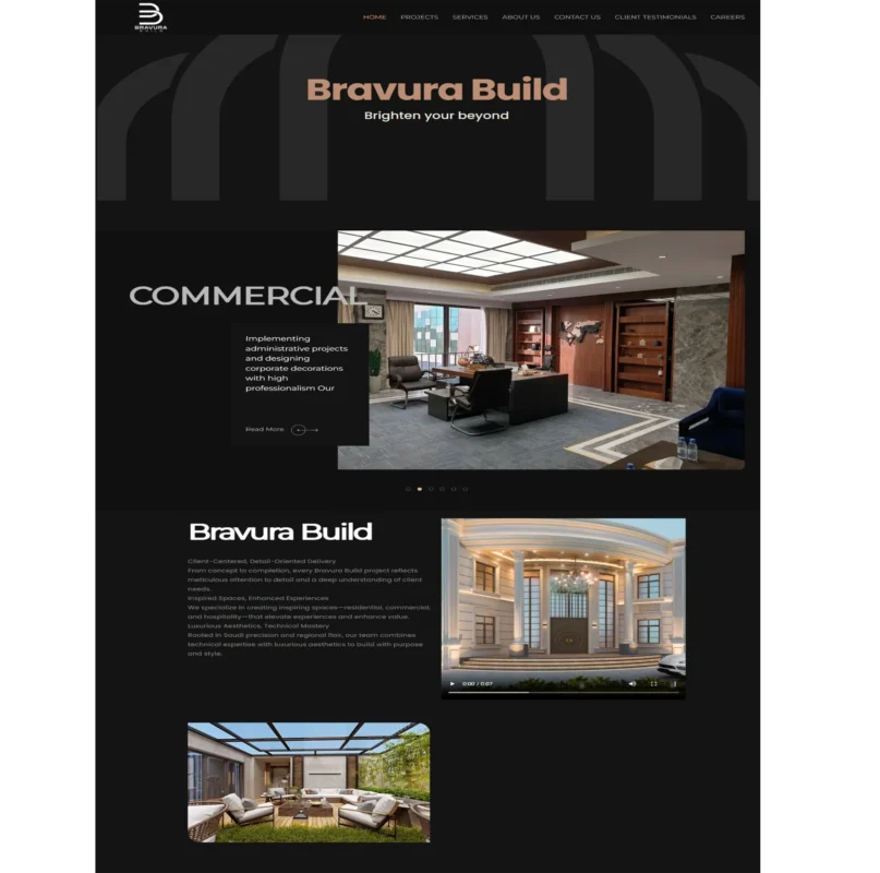 bravurabuild.com is a Saudi, Riyadh-based design & build company that delivers end-to-end projects—from concept and interior design to construction, finishing, fit-out, custom furniture, and project management. The site highlights 12+ years of experience in Saudi Arabia, showcases residential and commercial work (e.g., villas and infrastructure-adjacent projects), and provides direct Saudi contact details and WhatsApp for inquiries. Pages include an About section, projects/portfolio, and a contacts page with KSA phone numbers, confirming local presence in Riyadh.
